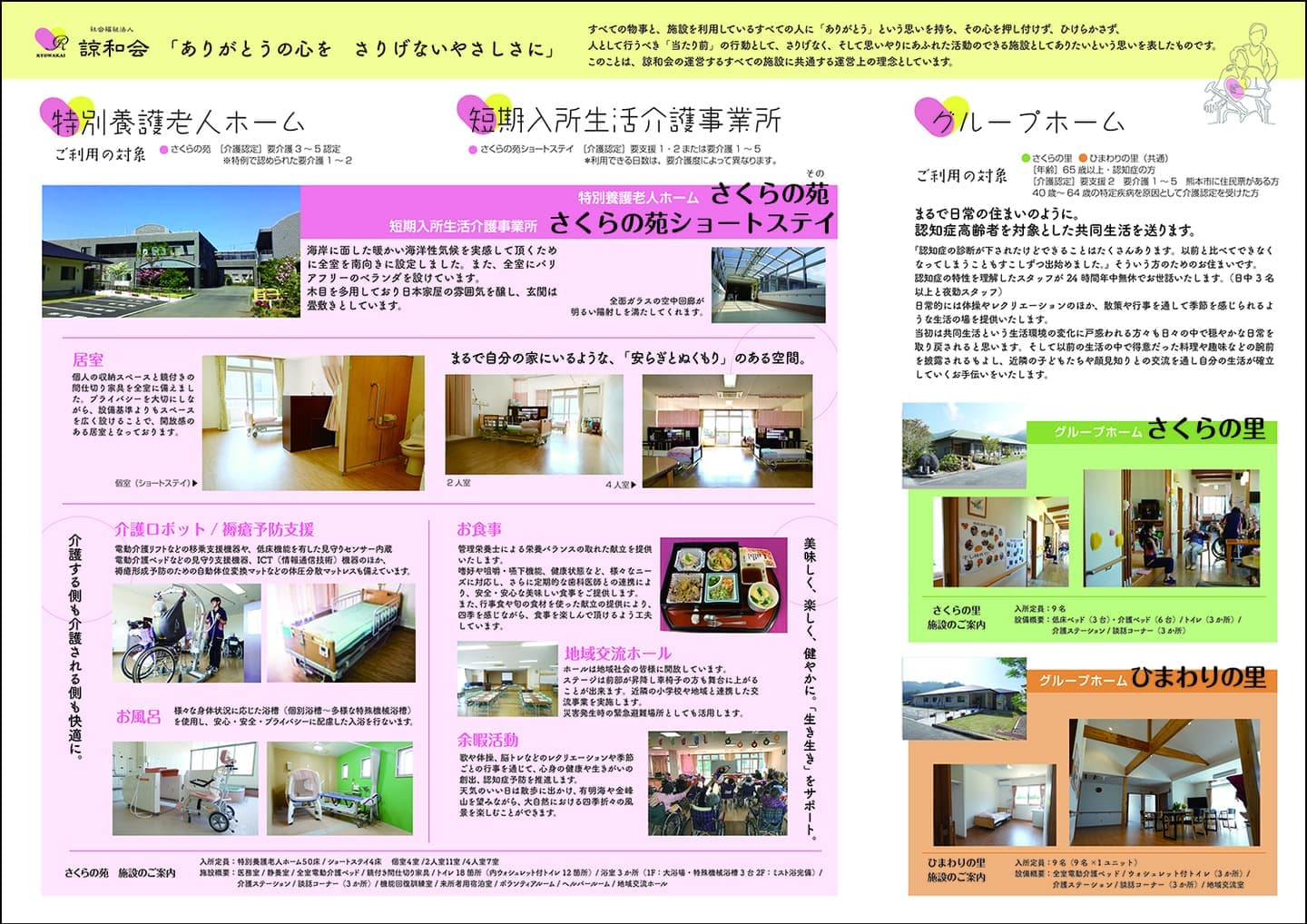 パンフレット表面 パンフレット中面 ●諒和会パンフレット(ダウンロード)⇒ 諒和会紹介パンフレット(A3/2ページ).pdf(4.2MB) 社会福祉法人とは 諒和会パンフレット 施設運営理念 名前の由来 施設経営法人 職員網領 施設運営概要 諒和会沿革 入札情報 個人情報に関する基本方針 会計情報 その他 各施設自己評価 虐待の防止のための指針 身体拘束等の適正化に関する指針 各施設苦情対応 [資料]運営推進会議議事録 アクセスマップ